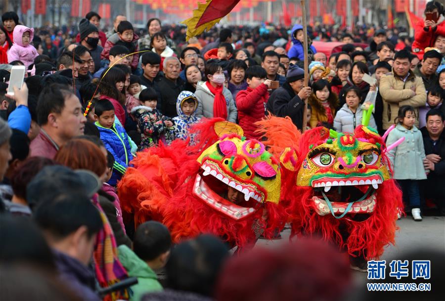 2月8日,演員在河北省廣宗縣民間文化藝術節上表演舞獅。當日,河北省廣宗縣舉辦民間文化藝術節,一千多名農民演員通過舞獅、扭秧歌、跑旱船等方式迎接即將到來的元宵佳節。新華社記者牟宇攝