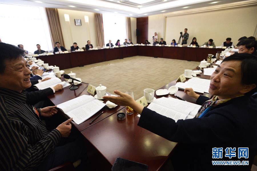3月5日,全國政協委員吉永華(前左)在小組討論政府工作報告時發言,鄰座的李鴻(前右)委員即席補充。新華社記者王建華攝
