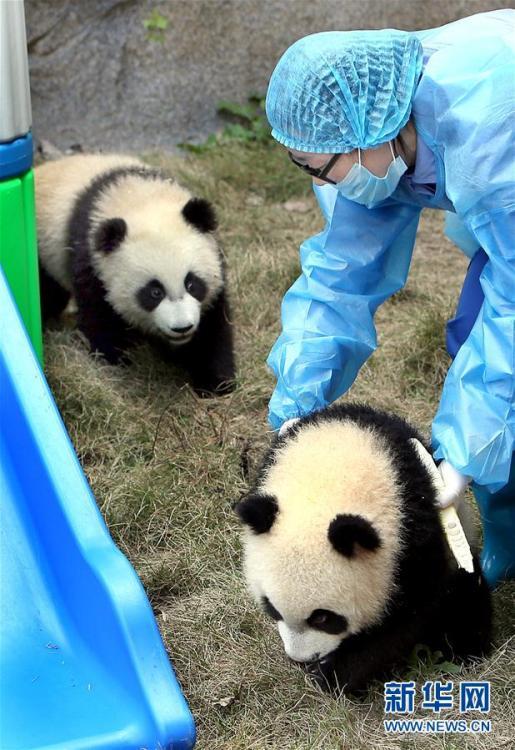 4月22日,飼養員將大熊貓龍鳳胎寶寶移到室外活動場。新華社記者凡軍攝圖片來源:新華網