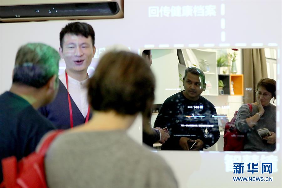 10月13日,嘉賓在展覽上了解智能家庭展臺。當日,由外交部、商務部、國家外專局邀請的外國駐華使節、在華工作的外國企業界人士和專家來到北京展覽館,參觀『砥礪奮進的五年』大型成就展。展覽分10個主題內容展區和1個特色體驗展區,全面介紹了中國經濟社會發展新成就,中國共產黨治國理政新理念以及人民群眾生產生活發生的新變化。新華社記者張玉薇攝