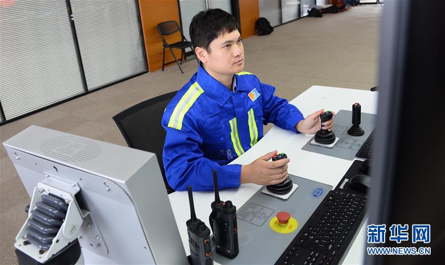 10月18日,山東青島港碼頭遠程操控員趙志在工作中。『十九大報告中對國家未來的展望與規劃令人鼓舞,作為一線工人,尤其應該發揮實乾精神,把本職工作和國家發展結合好。』趙志說。