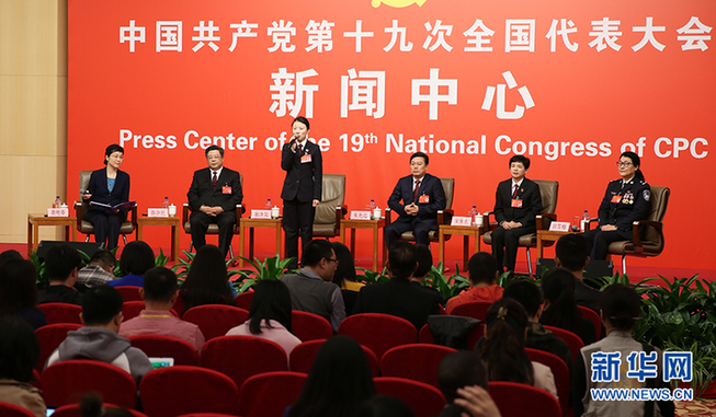 10月19日,十九大新聞中心舉辦集體采訪,邀請政法戰線代表談全面推進依法治國。圖為采訪現場。新華網 郝廣鵬 攝