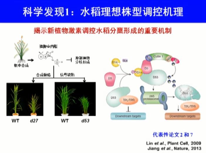 項目第二完成人中國科學院上海生科院植生生態所韓斌院士:解決了這個株型影響控制產量性狀的一個最主要的科學問題。過去這個株型的改變對產量影響非常大,能不能找到一個最好的理想株型,這個關鍵基因,或者叫關鍵因子,最後通過利用這個基因資源,在育種上能夠提高水稻的產量,能夠用分子設計的手段提高產量,同時又能兼顧品質的質量,因為有的時候這個產量提高了,可能品質會下降。