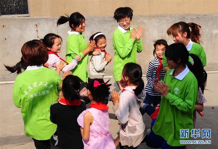2011年4月28日,武漢理工大學研二學生郎坤和農民工子弟學校武漢凌智小學的孩子們一起在屋頂平臺上做游戲。新華社記者程敏攝