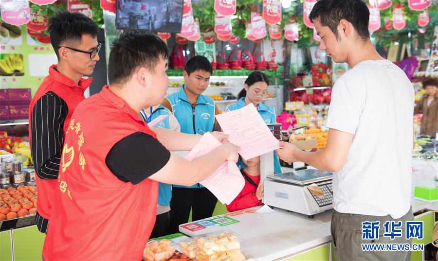 10月31日,八裡店鎮中心片區網格員(藍衣者)和志願者(紅衣者)對一家店鋪進行平安問卷調查。八裡店鎮目前已實現全域網格員工作機制,全體網格員下沈村、社一線,了解社情民意,化解矛盾糾紛,服務村社群眾。新華社記者翁忻暘攝