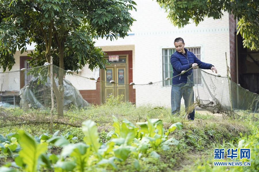 1月7日,趙澤倫在中壩島自家菜地裡整理用漁網做成的圍欄。新華社記者劉潺攝