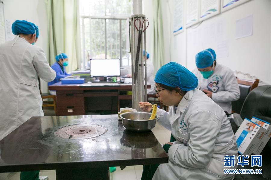 1月27日,在貴州省畢節市第三人民醫院感染科,黃迪(前)在辦公室吃午餐。新華社發