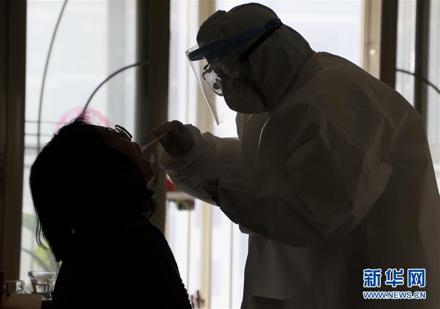 2月10日,王莉莉(右)為一名疫區返鄉人員采集鼻咽拭子。新華社發(杜昱葆攝)