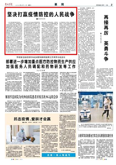 在舉國上下、軍地協同抗擊疫情的關鍵時刻,習主席在北京市調研指導新型冠狀病毒肺炎疫情防控工作並發表重要講話。習主席的重要講話站在全局的高度,突出問題導向、彰顯務實作風,對堅決打贏疫情防控的人民戰爭、總體戰、阻擊戰再次作出全面部署,必將鼓舞和激勵全黨全軍全國各族人民同心協力、英勇奮斗、共克時艱,努力取得疫情防控斗爭的全面勝利。請關注今日出版的《解放軍報》的詳細報道——