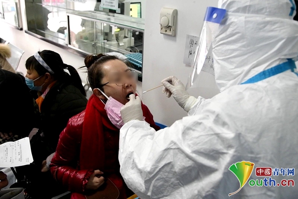 發熱門診醫護人員為患者進行咽拭子標本采樣。武漢協和醫院供圖
