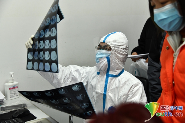 發熱門診醫護人員察看患者CT片。武漢協和醫院供圖