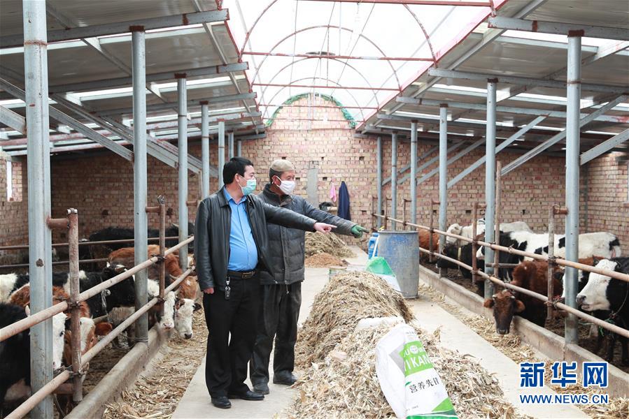 在甘肅省臨夏回族自治州廣河縣莊窠集鎮西坪村,全國人大代表馬天龍(左)和養牛戶馬志德討論養殖問題(3月10日攝)。新華社發(杜哲宇攝)