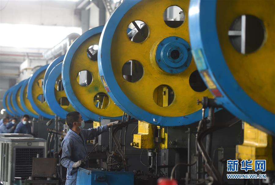 工人在位於店口鎮的浙江盾安智控科技股份有限公司鍛壓車間內操作(2月23日攝)。位於浙江省諸暨市的工業重鎮店口鎮在嚴格疫情防控的同時,由政府出資包車前往多地幫助企業接回員工返崗復工,並推出鏈式復工復產相關政策,協調當地大企業『以大帶小』幫助產業鏈條上的中小企業解決人員、住宿等問題。新華社記者韓傳號攝