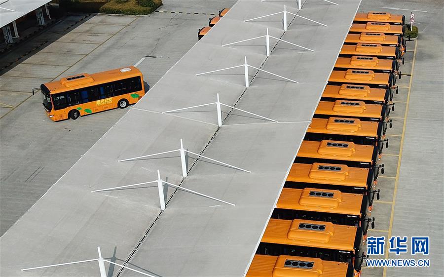 2018年11月10日,在江蘇省泰興市公交總站,一輛純電動公交車入站充電(無人機照片)。這是中國越來越美的五年——藍天越來越多,江河越來越清,生態越來越好……『十三五』期間,我國生態環境顯著改善,人民群眾的生態環境獲得感、幸福感和安全感不斷增強。新華社記者季春鵬攝