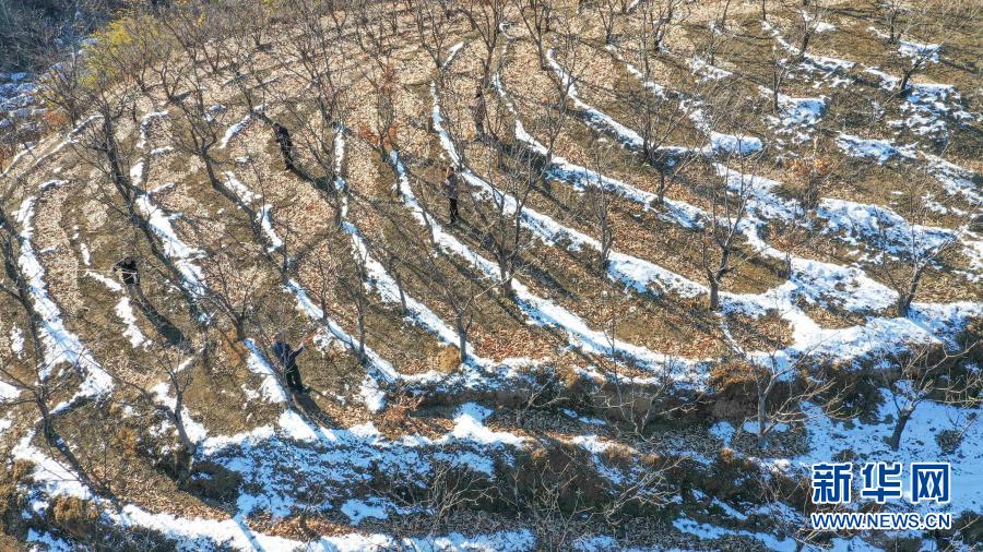 11月22日,河北唐山遵化市侯家寨鄉禪林寺村的農民為栗樹剪枝(無人機照片)。