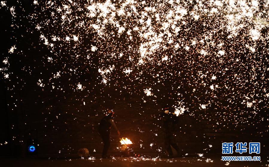 2月22日,在山東省臨沂市郯城縣郯國古城景區,民間藝人表演『打鐵花』。