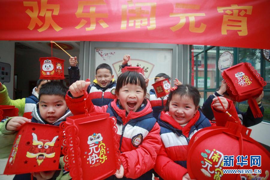 2月25日,在江蘇省揚州市文匯街道春江社區,小朋友展示自己制作的花燈。