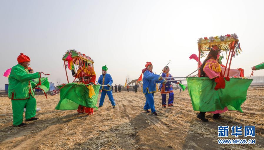 2月25日,河北唐山遵化市西留村鄉後鋪村的民間藝人排練太平車民俗節目。新華社發(劉滿倉攝)