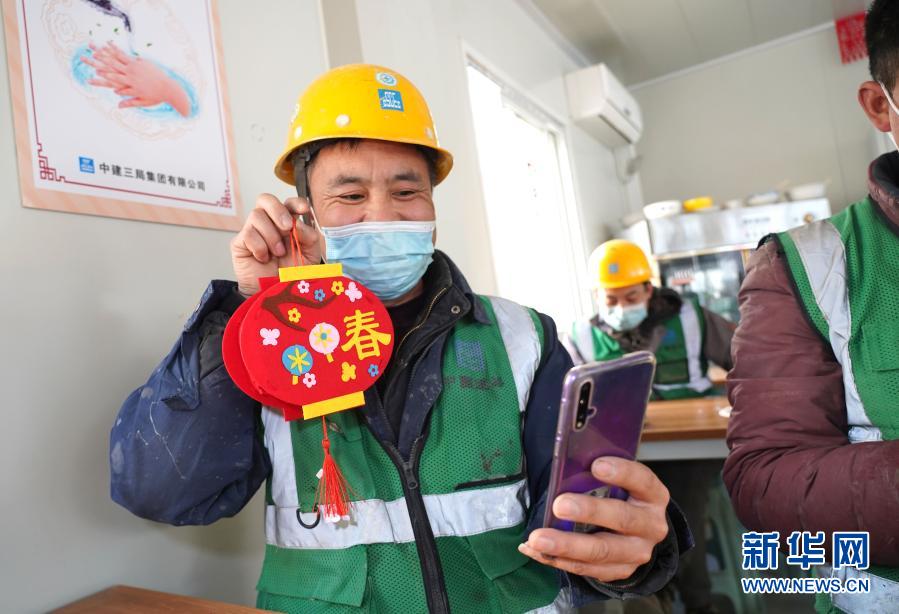 2月25日,在雄安新區G2組團安置房項目建設工地食堂,來自河南的水電工申海慶通過視頻與家人分享快樂。新華社記者纔揚攝