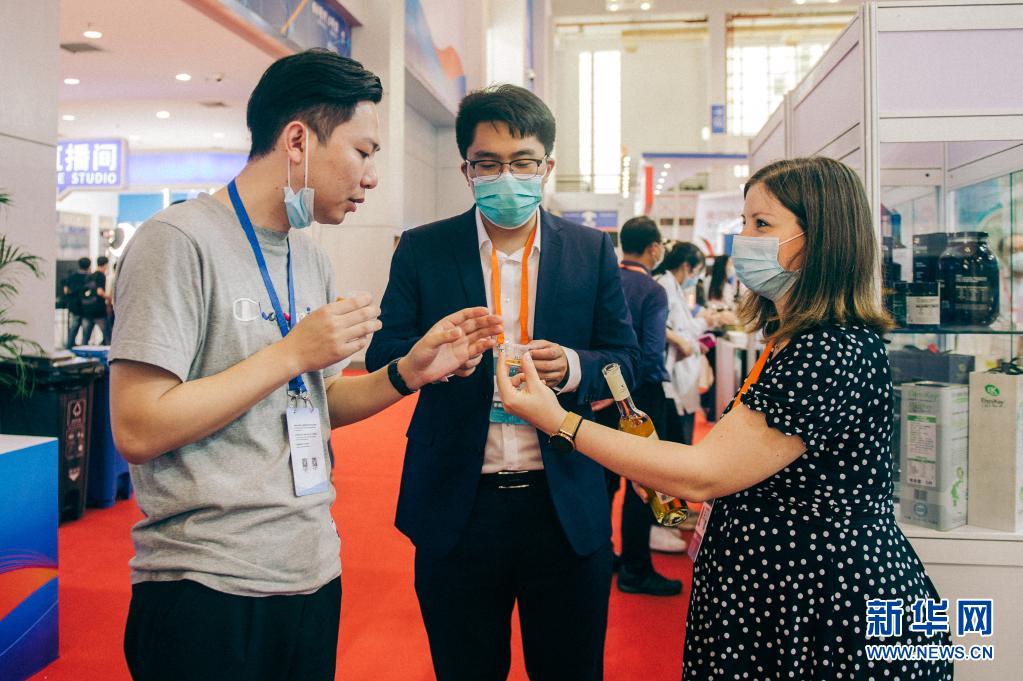 6月9日,埃萊妮(右)在博覽會現場為參觀者提供試喝的樣酒。