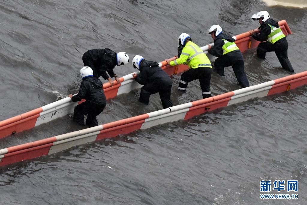 7月20日,交通警察在鄭州市花園路冒雨修復交通設施。