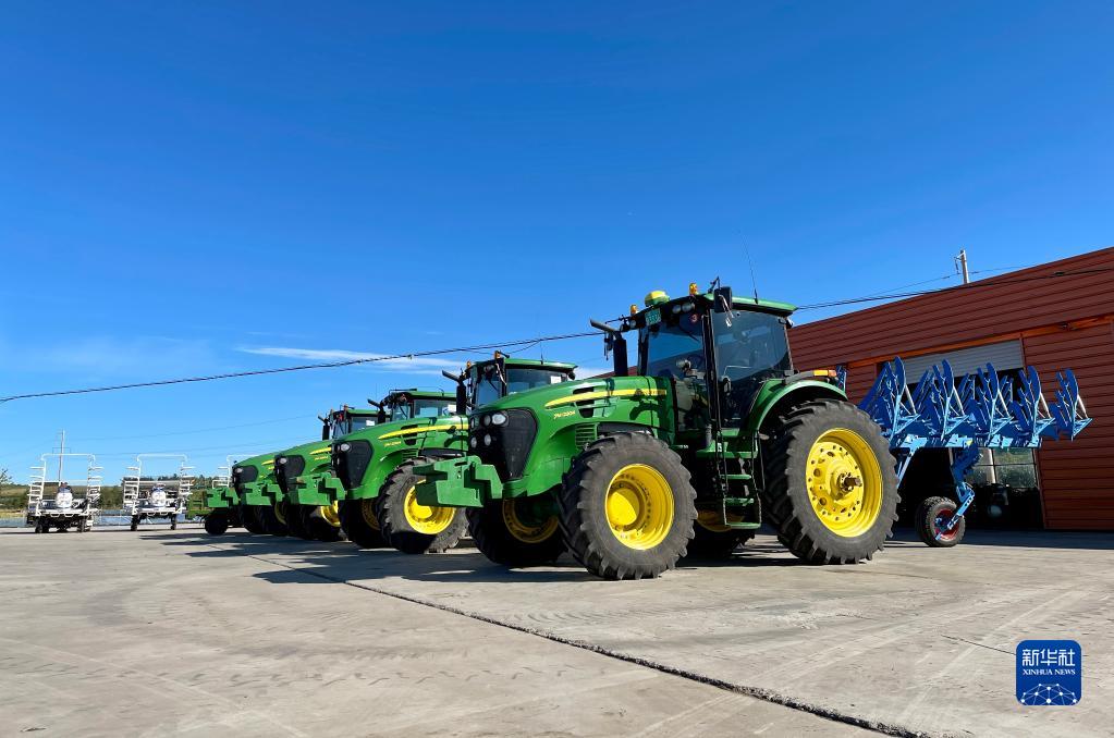 在黑龍江省北安市革命現代農機專業合作社,現代化農機整齊排放(9月18日攝)。新華社記者楊思琪攝