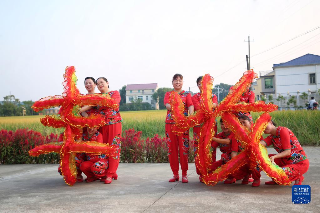 在湖南省汨羅市汨羅鎮九雁村稻田旁的小廣場上,村裡的婦女們在排練以豐收為主題的廣場舞(9月17日攝)。新華社發(胡清攝)