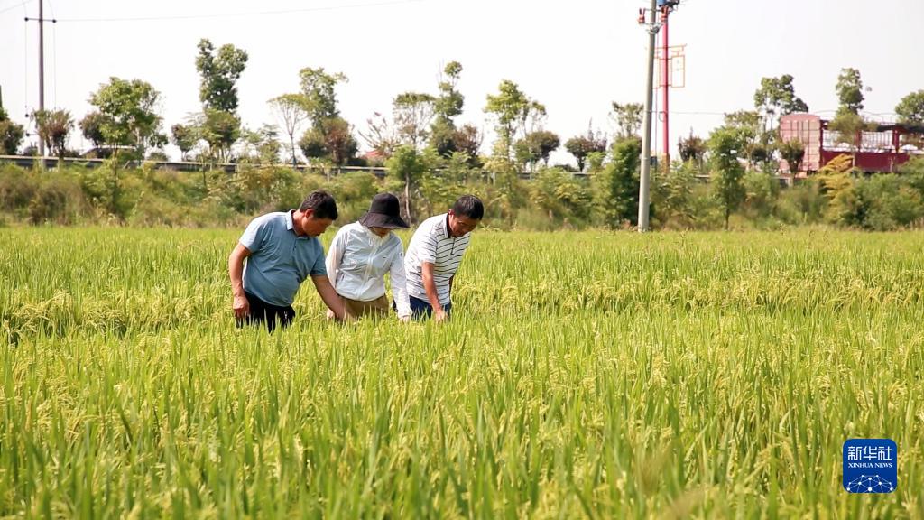 在汨羅鎮江景村,汨羅市農業農村局的兩名技術人員正查看『泰優390』的結實率。根據各家情況,他們向村民們科普如何更好地做到綠色病蟲害防控、調整農藥和化肥用量。
