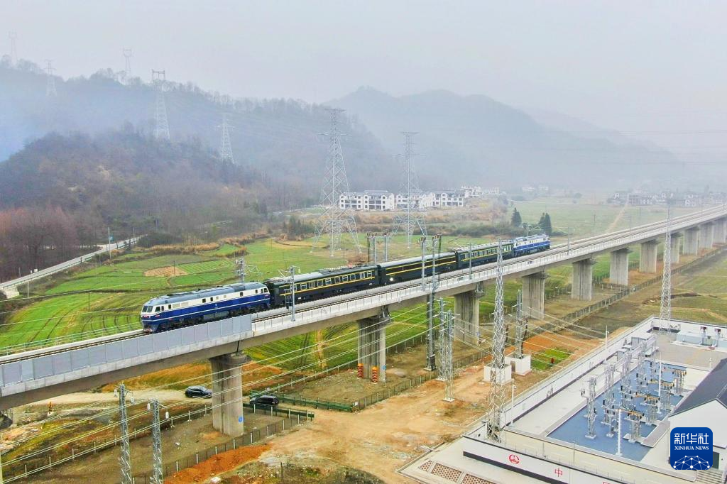1月15日,檢測列車行駛在池黃高鐵湯劉特大橋上。